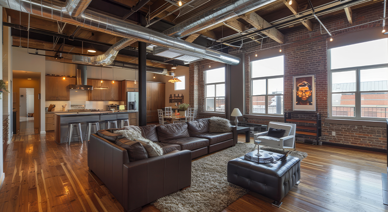 Loft industriel avec murs en briques et mezzanine